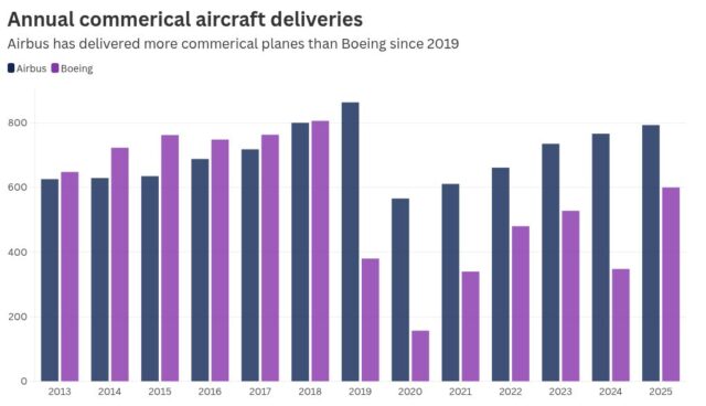 Airbus ha consegnato 193 aerei in più rispetto a Boeing nel 2025, ma Boeing ha ricevuto più ordini per la prima volta dal 2018.