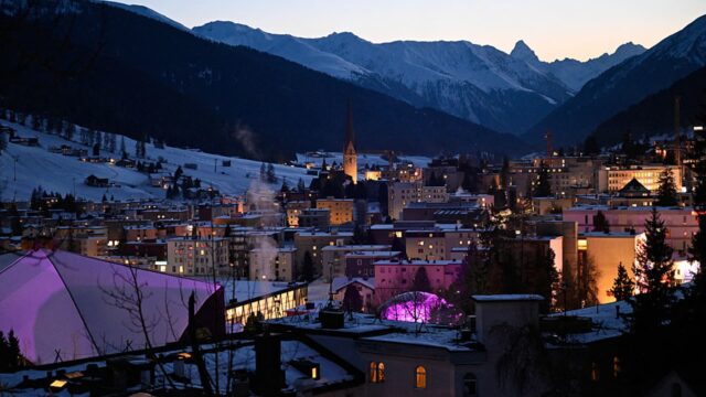 Questa fotografia scattata il 20 gennaio 2026 mostra una vista generale della città di Davos al calar della notte durante l’incontro annuale del World Financial Discussion board (WEF) a Davos. Il World Financial Discussion board si svolgerà a Davos dal 19 al 23 gennaio 2026.