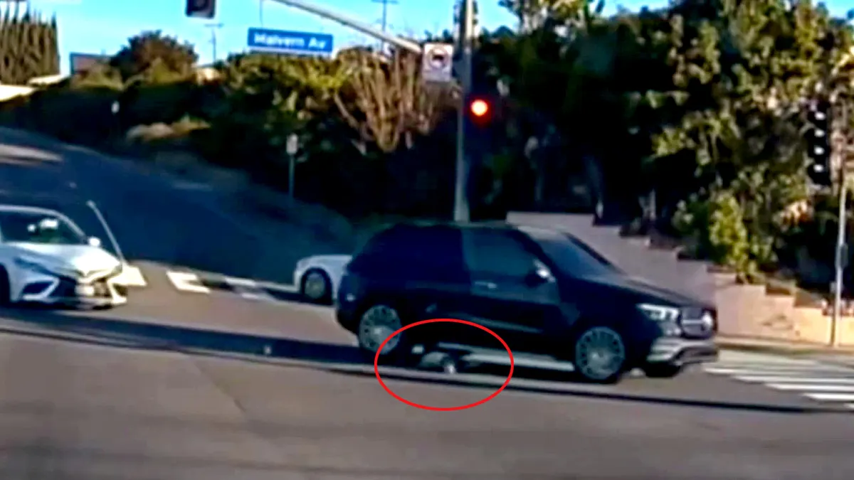 Un’auto che seguiva il SUV ha evitato per un pelo di colpire il bambino e il SUV. (Dipartimento di polizia di Fullerton)