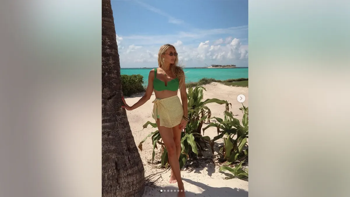 In una delle foto, si può vedere Aldean appoggiarsi a una palma e guardare in lontananza, mentre indossa un bikini verde. Ha abbinato il look advert una gonna gialla, orecchini pendenti e un paio di occhiali da sole marroni.
