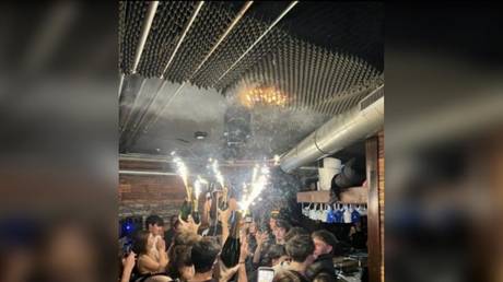 Foto e video condivisi on-line mostrano almeno sei bottiglie con le stelle filanti accese tenute in alto dal personale e dagli avventori. In una delle foto, si vede una donna seduta sulle spalle di un altro con le bottiglie, che le agita troppo in alto, apparentemente colpendo il soffitto.