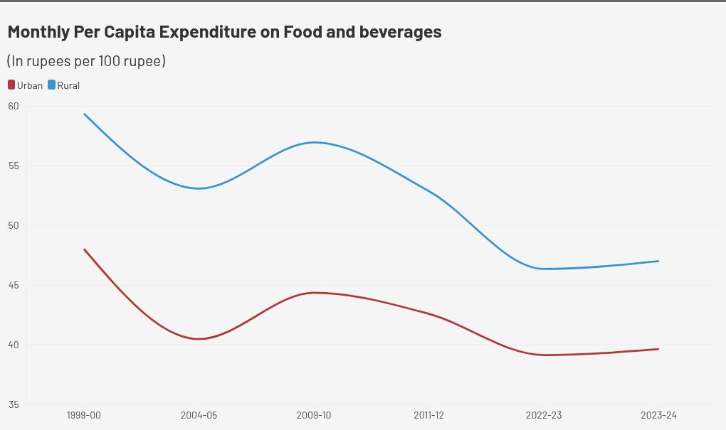 Il calo della quota MPCE su cibo e bevande sia per le aree urbane (da ₹ 48 a ₹ 39 per ₹ 100) che per quelle rurali (da ₹ 59 a ₹ 47 per ₹ 100) conferma la legge di Engel, che afferma che all’aumentare del reddito reale, la proporzione del reddito speso per il cibo diminuisce, anche se la spesa assoluta aumenta. Il grafico seguente mostra la spesa mensile professional capite per cibo e bevande (in rupie per 100 rupie)