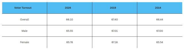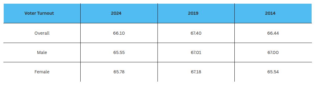 L’affluenza complessiva degli elettori alle elezioni generali è rimasta notevolmente stabile negli ultimi tre cicli. I dati Lokniti-CSDS mostrano un’affluenza alle urne del 66,44% nel 2014, in lieve aumento al 67,40% nel 2019 e stabilizzandosi al 66,10% nel 2024.
