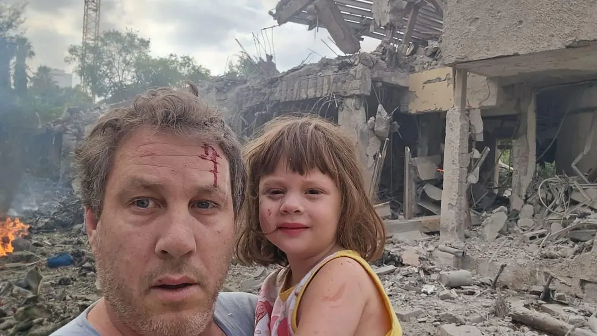 Eyal, marito di Michal Weits, tiene la figlia davanti alle macerie della loro casa a Tel Aviv colpita da un missile iraniano durante la guerra dei 12 giorni. (Michal Weits)