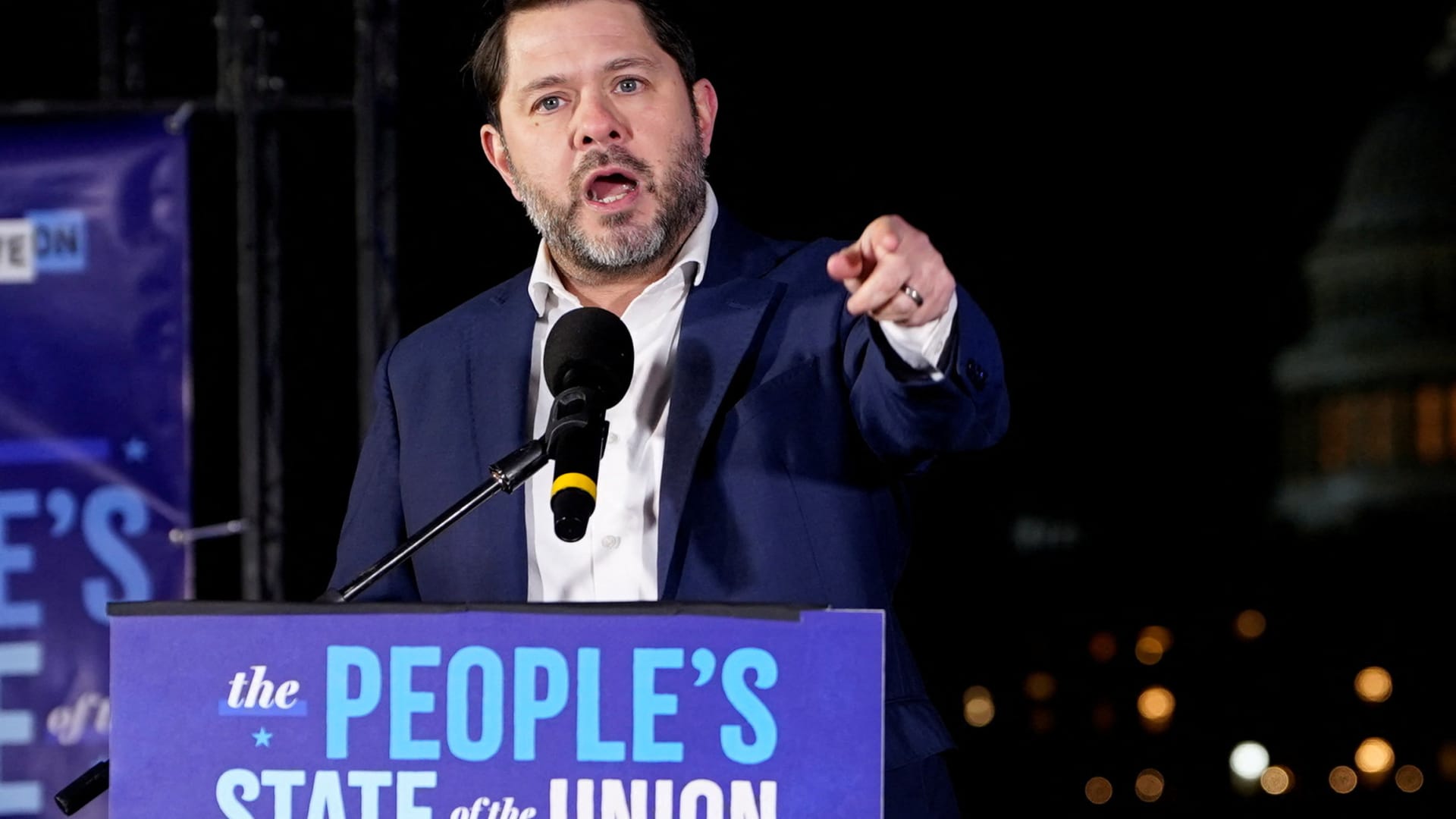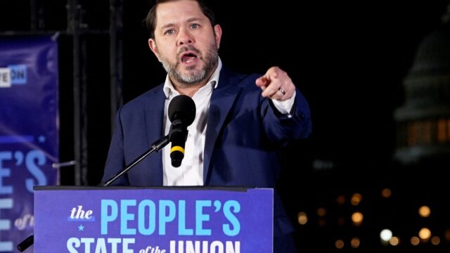 Il senatore americano Ruben Gallego (D-AZ) parla durante l’evento “Stato popolare dell’Unione” prima del discorso sullo stato dell’Unione del presidente americano Trump a Washington, DC, Stati Uniti, il 24 febbraio 2026.