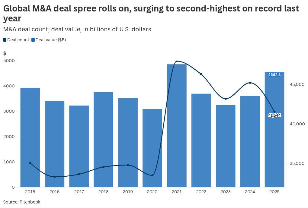 Ha superato il precedente massimo di 4,86 trilioni di dollari stabilito nel 2021, poiché il numero di accordi e l’attività di valore hanno raggiunto livelli document, ha affermato PitchBook. L’attività ha accelerato quando le banche centrali hanno tagliato i tassi di interesse, le valutazioni sono migliorate e le aziende hanno aumentato la spesa per l’intelligenza artificiale.