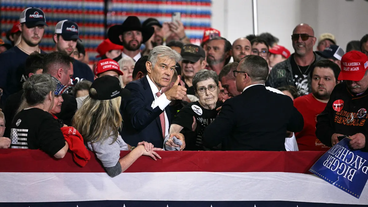 Il dottor Mehmet Oz, amministratore dei Facilities for Medicare e dei servizi Medicaid, ha espresso il suo consenso dopo aver aiutato una donna che è svenuta mentre il presidente Donald Trump parlava alla Verst Logistics di Hebron, nel Kentucky, l’11 marzo. (Jim WATSON/AFP tramite Getty Pictures)