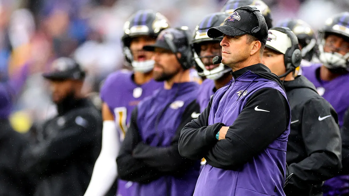 L’allenatore John Harbaugh dei Baltimore Ravens guarda nel quarto quarto contro i Buffalo Payments all’M&T Financial institution Stadium di Baltimora, nel Maryland, il 2 ottobre 2022. (Patrick Smith/Getty Photographs)