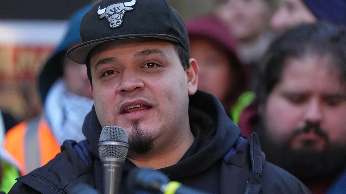 Kilmar Abrego Garcia parla durante una manifestazione prima di un controllo obbligatorio presso l’ufficio di immigrazione e controllo doganale di Baltimora il 12 dicembre, dopo essere stato rilasciato dalla detenzione. (Stephanie Scarbrough/AP)