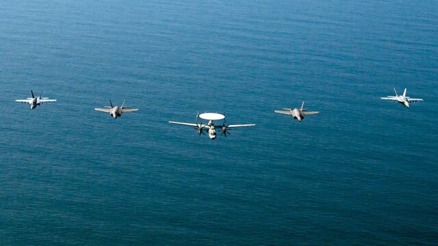 Una veduta aerea della USS Abraham Lincoln Service Strike Group mentre operava nel Mar Arabico, scortata da due navi di rifornimento militare e due navi della Guardia Costiera degli Stati Uniti, mentre gli aerei da combattimento della Service Air Wing 9 conducevano operazioni di volo nel Mar Arabico, il 6 febbraio 2026. (US CENTCOM/Handout/Anadolu tramite Getty Photos)