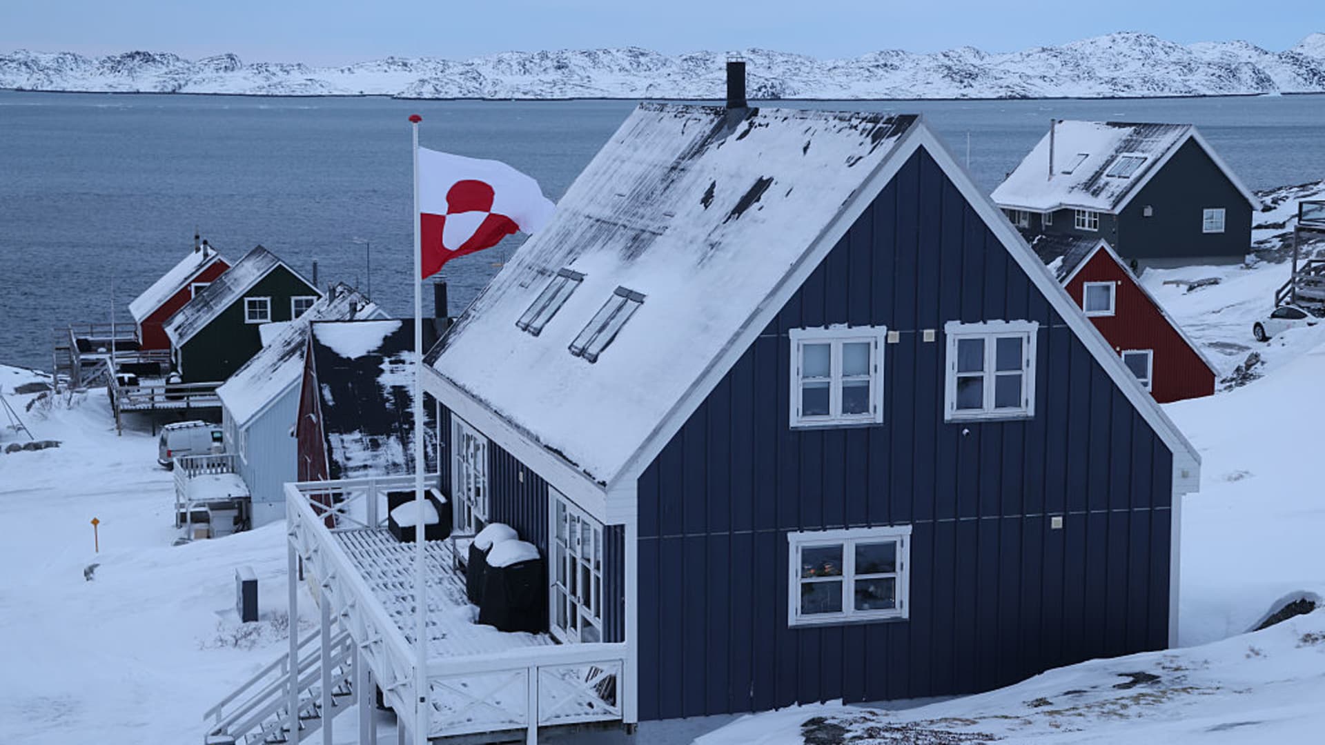 Una bandiera groenlandese sventola su una casa residenziale il 21 gennaio 2026 a Nuuk, Groenlandia.