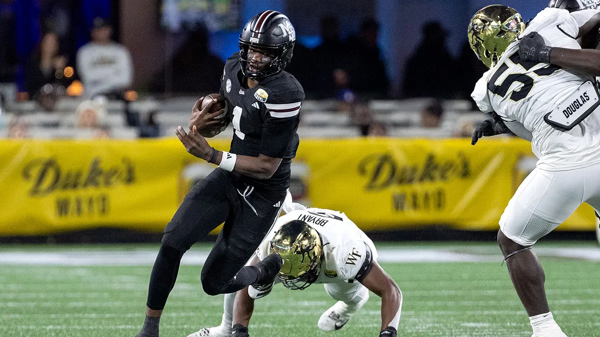 Il quarterback dei Mississippi state Bulldogs Kamario Taylor (1) afferra la gamba dopo un imbarazzante contrasto durante la partita di soccer del Duke’s Mayo Bowl contro i Wake Forest Demon Deacons al Financial institution of America Stadium. La partita si è svolta a Charlotte, nella Carolina del Nord, il 2 gennaio 2026. (John Byrum/Icon Sportswire tramite Getty Photographs)
