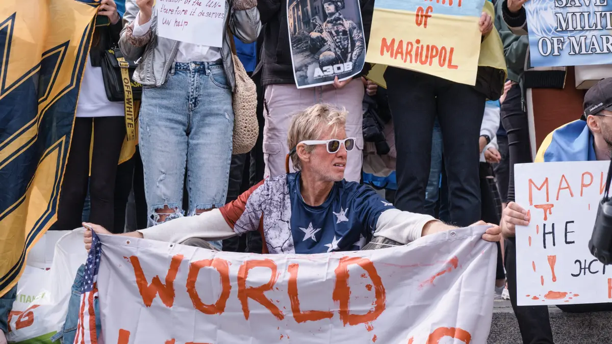 Ryan Routh è visto nel maggio 2022 con in mano uno striscione con la scritta “World Assist Us” durante una manifestazione a Kiev, Ucraina. (Artem Gvozdkov/International Photos Ucraina tramite Getty Photos)