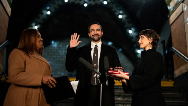 Mamdani presta giuramento come sindaco su un paio di Corani di famiglia. (Amir Hamja/Pool tramite Reuters)