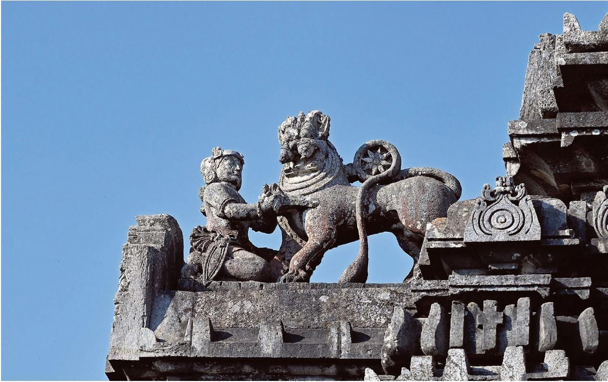 Marchio dinastico: l’Hoysala lanchana, raffigurante il leggendario fondatore Sala che uccide una tigre, è scolpito in cima al tempio Lakshmidevi.