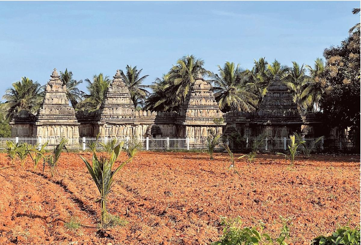Meraviglia duratura: situato tra i campi agricoli nel distretto di Mandya, il tempio Panchalingeshwara del XIII secolo mostra un raro design Panchakuta, cinque santuari di Shiva rivolti a est allineati in fila e collegati da una sala con colonne, tutti incastonati in pietra sobria ma raffinata.