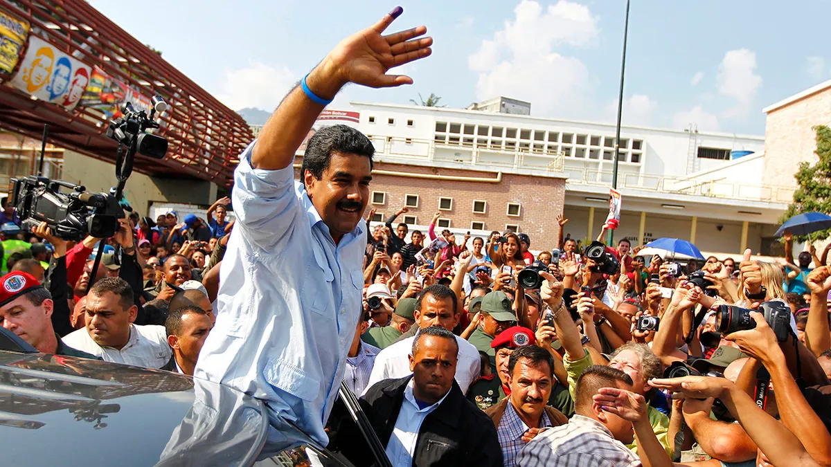 Il presidente venezuelano advert interim Nicolas Maduro saluta i sostenitori mentre se ne va dopo aver votato per il successore del defunto presidente Hugo Chavez, a Caracas il 14 aprile 2013. (Carlos Garcia Rawlins/Reuters)