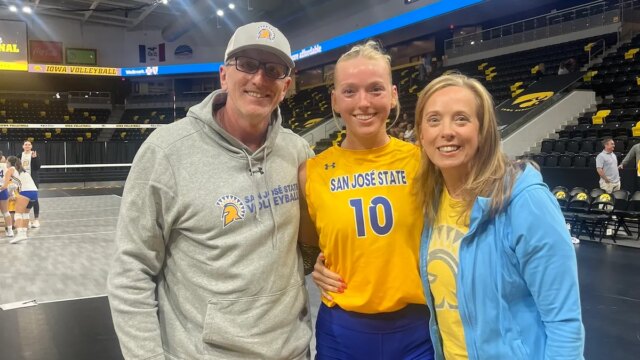 L’ex star della pallavolo SJSU Brooke Slusser e i suoi genitori Paul e Kim Slusser durante una partita dell’8 settembre, che secondo Kim è “l’ultimo bel ricordo che abbiamo del suo gioco”. (Per gentile concessione di Kim Slusser)