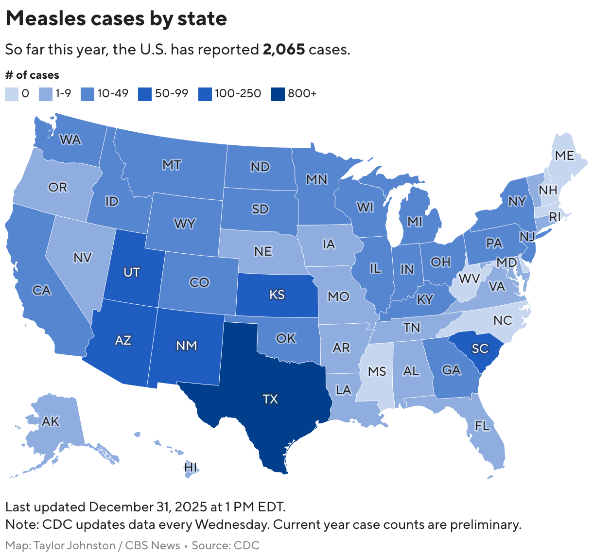 Il group di dati di CBS Information sta monitorando i casi confermati di morbillo a livello nazionale man mano che nuovi dati vengono rilasciati dai dipartimenti sanitari statali e dal CDC. (La mappa seguente viene aggiornata il mercoledì quando il CDC pubblica i suoi ultimi numeri settimanali.)