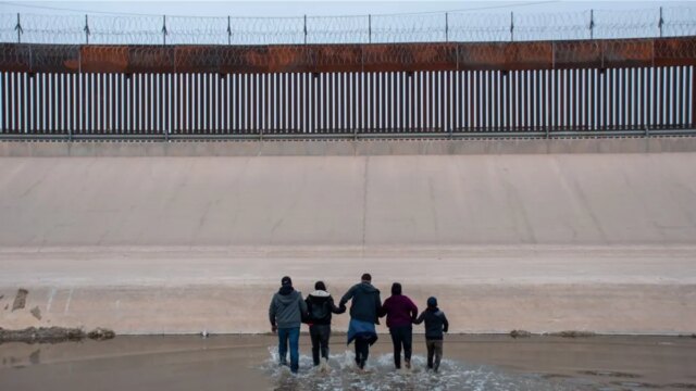 Una famiglia vista camminare verso una barriera che blocca il passaggio attraverso il confine degli Stati Uniti. (Dipartimento della Salute e dei Servizi Umani)