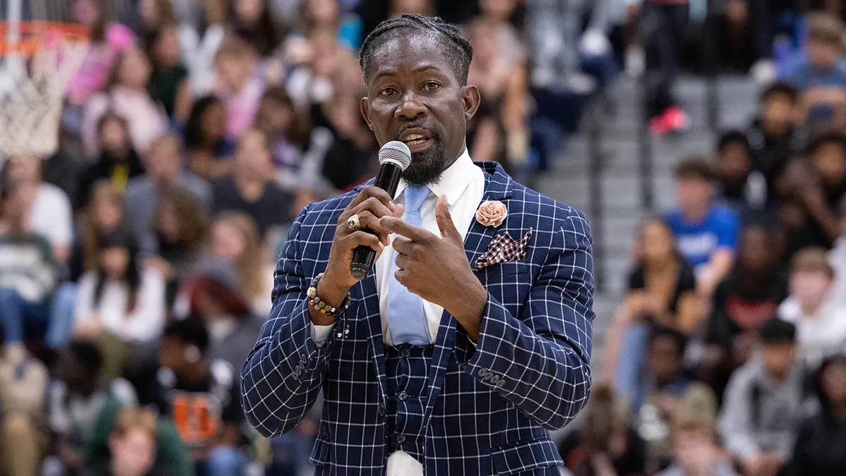 Ian Roberts, ex sovrintendente delle scuole pubbliche di Des Moines, parla agli studenti della Theodore Roosevelt Excessive College di Des Moines, il 21 ottobre 2024. (Scuole pubbliche Jon Lemons/Des Moines tramite AP)