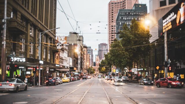 Attività su Elizabeth Avenue (all’incrocio tra Bourke St Mall), Melbourne in una giornata nuvolosa.