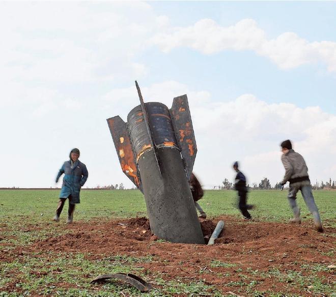 Innocenza nelle vicinanze: i bambini si riuniscono attorno a un missile inesploso in un campo aperto alla periferia di Qamishli, nella Siria orientale, il 5 marzo.