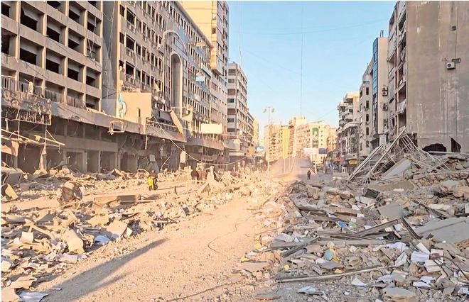 Strade di dolore: una strada disseminata di macerie e detriti dopo gli attacchi israeliani notturni sulla periferia meridionale di Beirut, il 6 marzo.