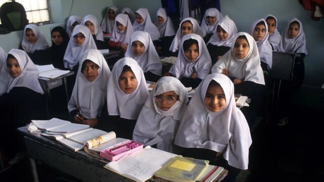 Ragazze della scuola primaria con il velo tradizionale sedute in una classe, Teheran, Iran, 1 ottobre 1997. (Kaveh Kazemi/Getty Pictures)