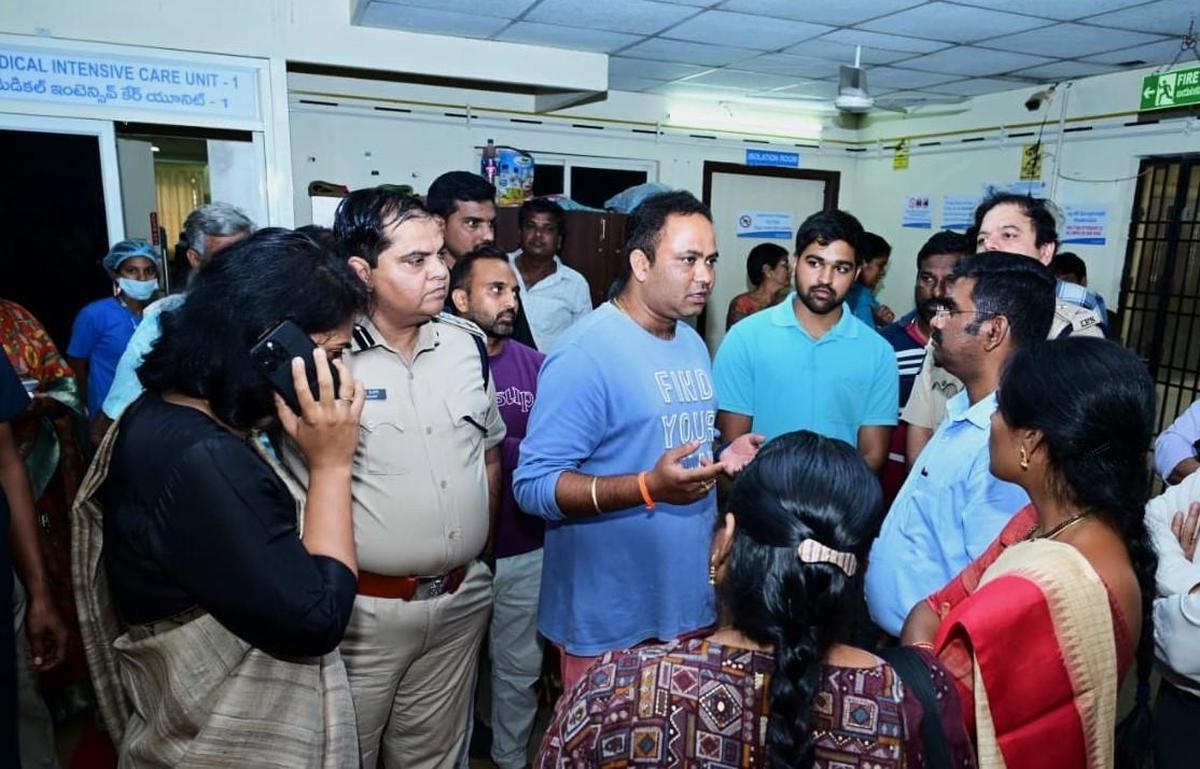 Familiari di pazienti che interagiscono con l’esattore distrettuale Kirthi Chekuri e l’SP D. Narasimha Kishore in un ospedale privato nella città di Rajamahendravaram.