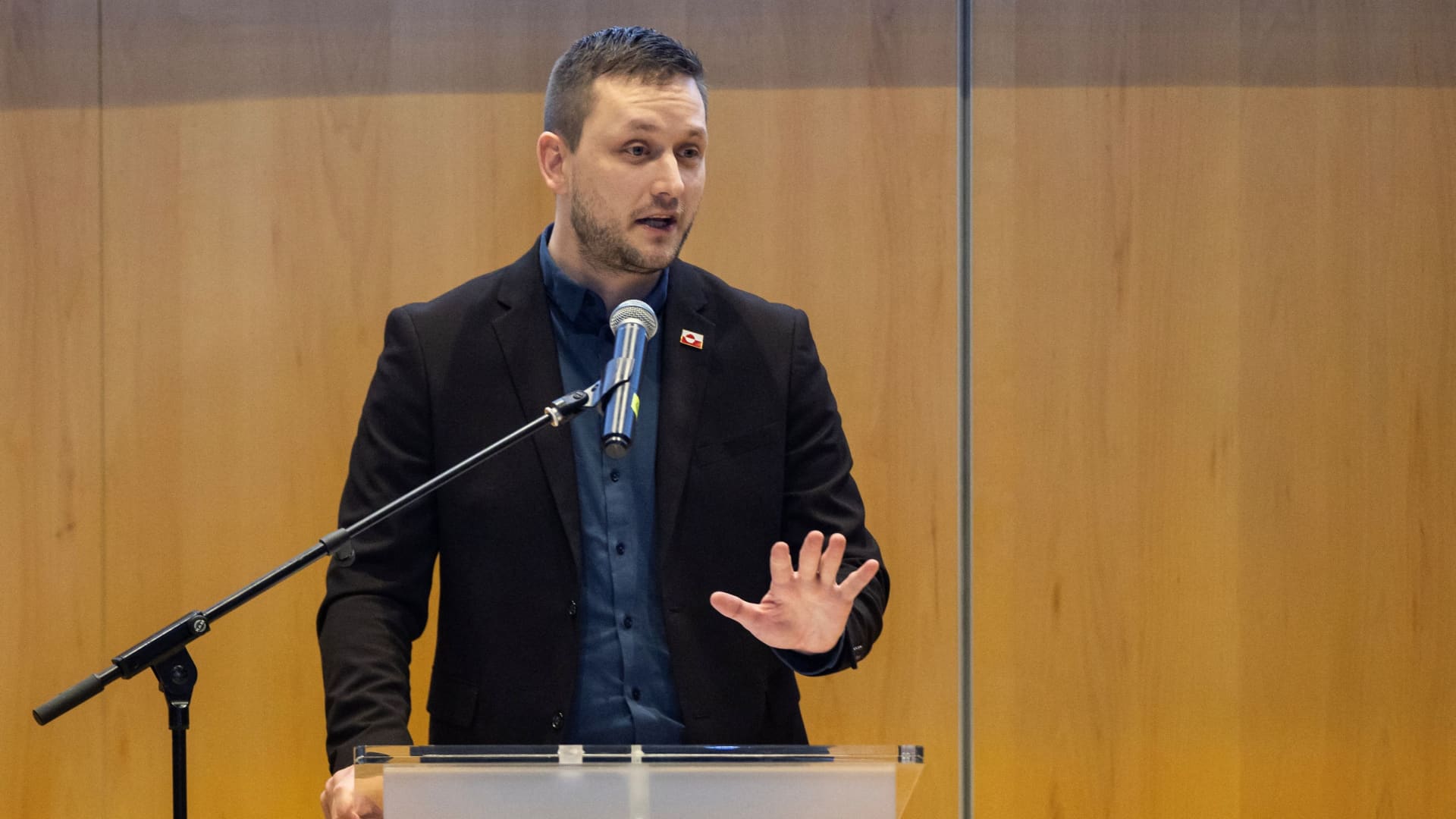Il primo ministro della Groenlandia Jens-Frederik Nielsen tiene una conferenza stampa a Nuuk, Groenlandia, il 22 gennaio 2026.