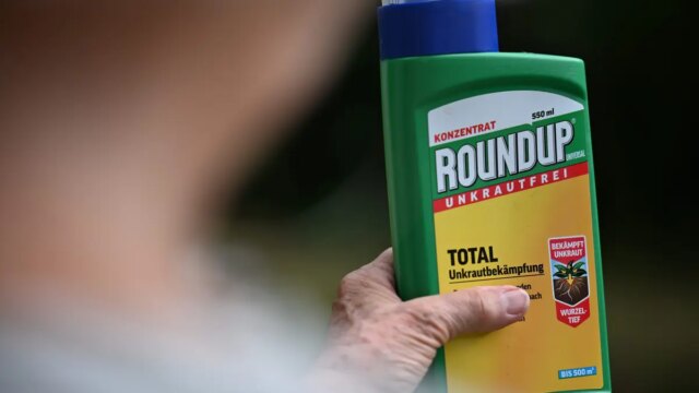 Una donna nel suo giardino tiene in mano una bottiglia del diserbante Roundup con il principio attivo glifosato. (Foto di Wolf von Dewitz/image Alliance tramite Getty Pictures)