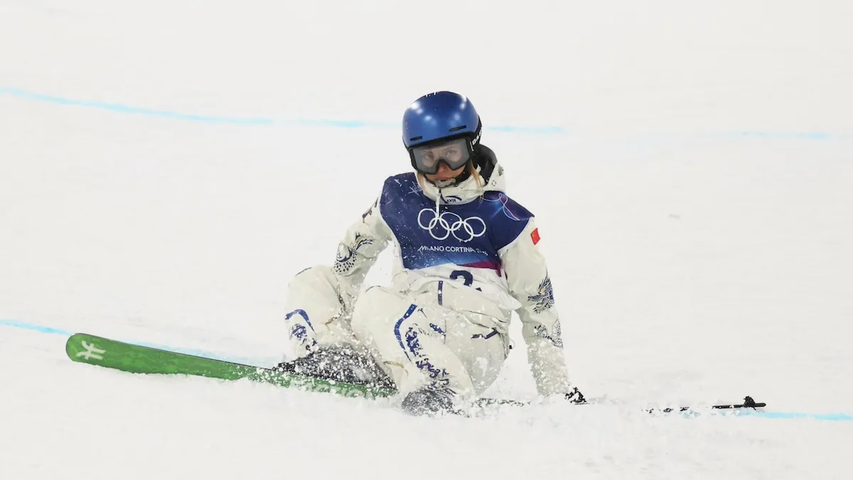 Eileen Gu del Workforce Individuals’s Republic of China cade nella qualificazione 1 dell’Halfpipe Freeski femminile il tredicesimo giorno dei Giochi Olimpici Invernali di Milano Cortina 2026 al Livigno Air Park il 19 febbraio 2026 a Livigno, Italia. (Cameron Spencer/Getty Photos)