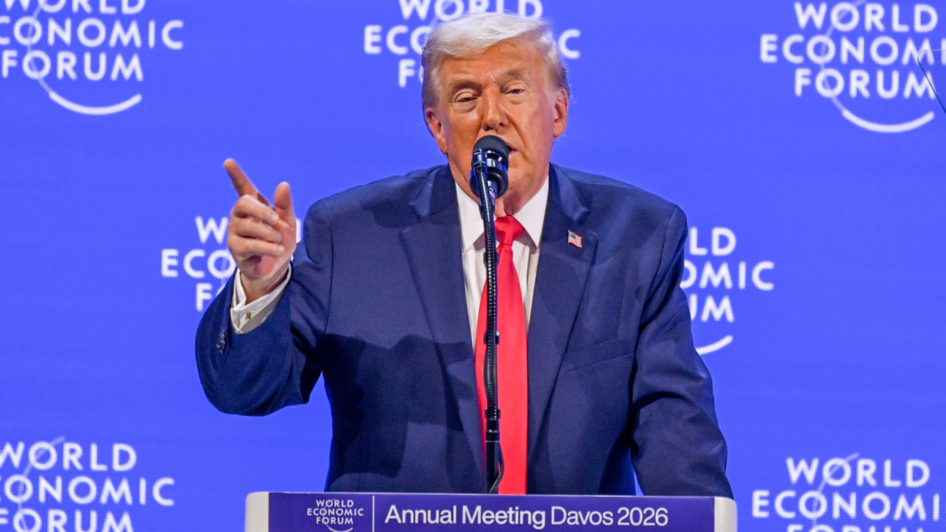 Il presidente degli Stati Uniti Donald Trump tiene un discorso durante la riunione annuale del World Financial Discussion board a Davos, in Svizzera, il 21 gennaio 2026.