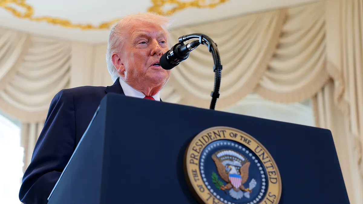 Il presidente Donald Trump parla durante una cerimonia di inaugurazione della strada a Mar-a-Lago a Palm Seaside, in Florida, il 16 gennaio 2026. I legislatori dello stato della Florida hanno approvato il cambio di nome di una parte di Southern Boulevard in President Donald J. Trump Boulevard. (Anna Moneymaker/Getty Pictures)