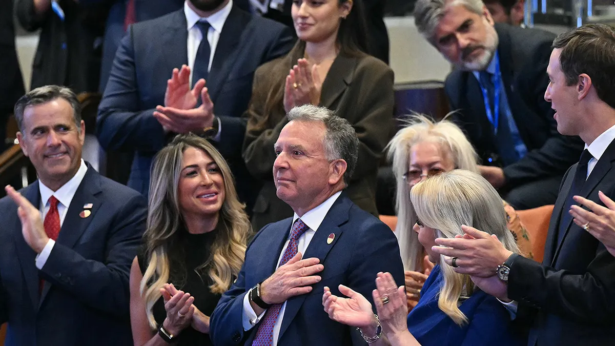 L’inviato speciale degli Stati Uniti in Medio Oriente Steve Witkoff riconosce gli applausi dei membri del parlamento israeliano, la Knesset, a Gerusalemme il 13 ottobre 2025. (Saul Loeb / POOL / AFP = tramite Getty Pictures)