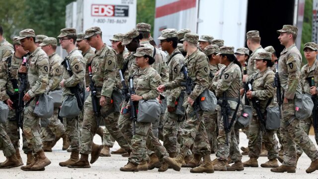 I membri della Guardia Nazionale del Texas si riuniscono a Elwood, Illinois, presso l’Military Reserve Coaching Middle nel sobborgo sud-occidentale di Chicago, il 7 ottobre 2025. Mercoledì l’amministrazione Trump ha dichiarato che rimuoverà le truppe della Guardia Nazionale da Chicago, Los Angeles e Portland, Oregon. (Brian Cassella/Chicago Tribune/Tribune Information Service tramite Getty Photographs)