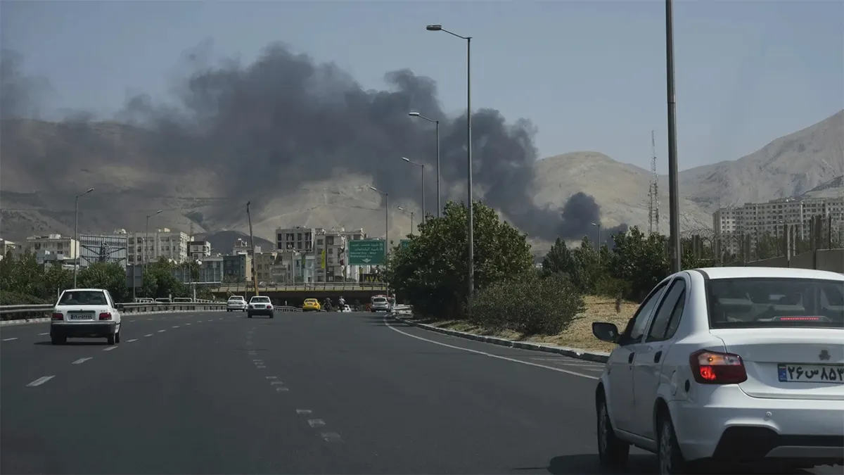 Le auto circolano su un’autostrada mentre il fumo si alza da un impianto di stoccaggio del petrolio dopo che sembrava essere stato colpito da un attacco israeliano sabato, a Teheran, Iran, lunedì 16 giugno 2025. (AP Photograph/Vahid Salemi)