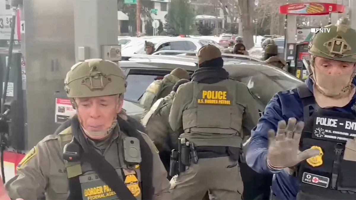 I video sembrano mostrare agenti federali della polizia di frontiera che prendono in custodia due uomini in una stazione di servizio a St. Paul, Minnesota. (FNTV)