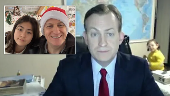 Riuscendo in qualche modo a mantenere la calma, Robert ha detto al presentatore della BBC “scusami”, mentre il caos si svolgeva dietro di lui.