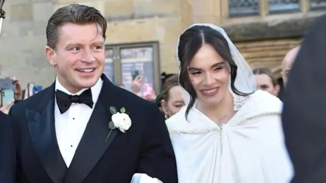 Le foto condivise del loro grande giorno hanno visto la sposa Holly arrivare all’Abbazia di Bathtub con un enorme mantello bianco per nascondere il suo vestito da occhi indiscreti.