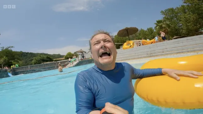 Il momento esilarante è arrivato quando Alan ha visitato un parco acquatico con la sua co-conduttrice Amanda Holden mentre rinnovavano la loro ultima proprietà in Grecia.