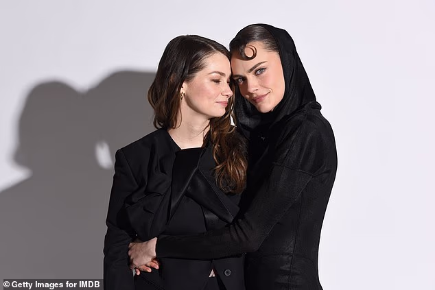 Cara sembrava vantarsi di uno spettacolo spigoloso in un abito nero con cappuccio con i capelli pettinati all’indietro separati da una ragazza dallo stile strategico.