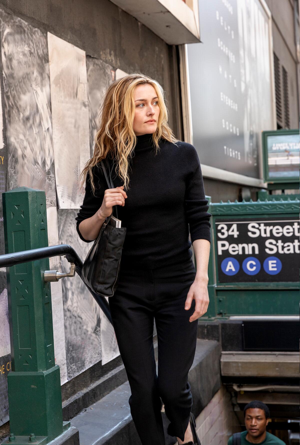 Sarah Pidgeon nel ruolo di Carolyn Bessette, direttrice della pubblicità presso il marchio di moda Calvin Klein.