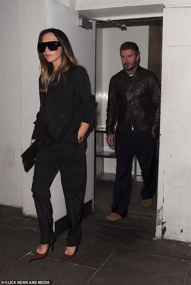Victoria ha optato per un look whole black per la sera mentre David ha sfoggiato una giacca di pelle scura e scarpe marrone chiaro