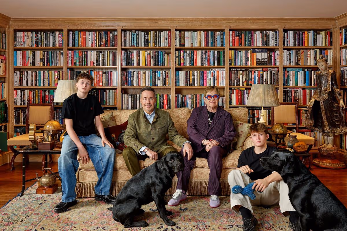 Mentre la famiglia tende a mantenere privata la propria vita familiare, Elton e David possono essere visti con i loro figli in un ritratto che è stato presentato alla Nationwide Portrait Gallery di Londra. Nella foto nella loro casa di famiglia, Elton e David possono essere visti con Zachary, 15 anni, ed Elijah, 13, e i loro due Labrador, Joseph e Jacob.