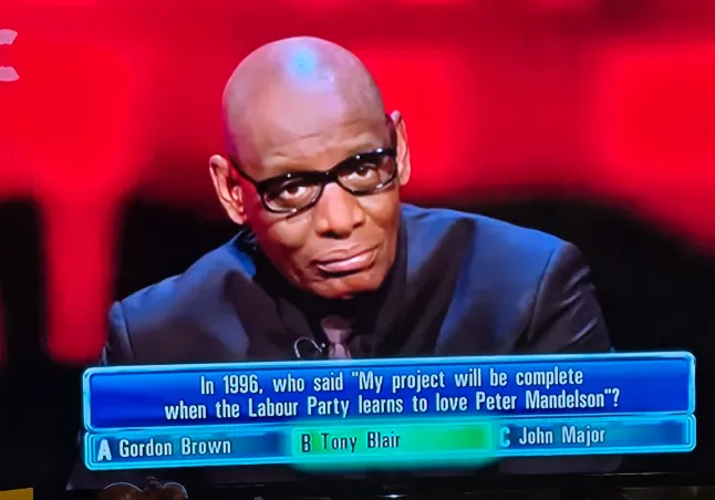 La domanda per intero diceva: “Nel 1996, chi disse: “Il mio progetto sarà completo quando il Partito Laburista imparerà advert amare Peter Mandelson?”
