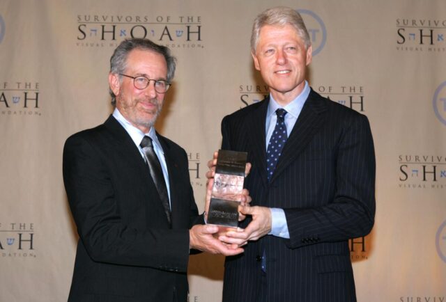 Il regista Steven Spielberg consegna al presidente Invoice Clinton il premio Ambassadors Humanity alla quinta cena annuale degli Ambasciatori per l’umanità in onore dell’ex presidente Invoice Clinton per sostenere i sopravvissuti della Shoah Visible Historical past Basis, tenutasi presso il teatro Amblin Common Studios il 17 febbraio 2005 a Los Angeles, California.