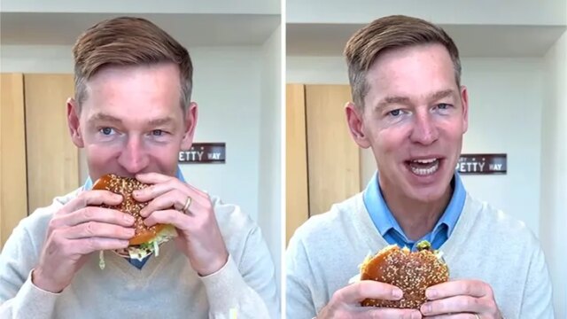 Nella clip ormai virale che viene arrostita on-line, Chris Kempczinski inizia a cantare le lodi dell’hamburger, poi in qualche modo sembra colto di sorpresa dalle cipolle croccanti… prima di prepararsi finalmente per il grande boccone e fare a malapena un’ammaccatura.