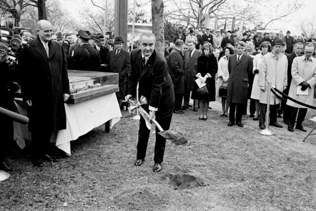 Il presidente Lyndon B. Johnson solleva una pala piena di terra durante le cerimonie inaugurali del John F. Kennedy Heart for the Performing Arts nel 1964 mentre i membri della famiglia Kennedy guardano.